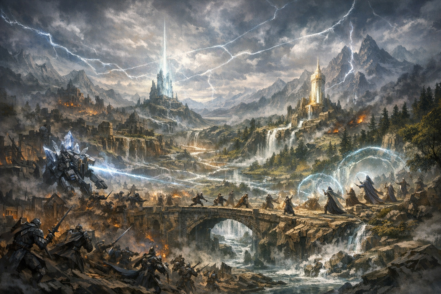 Over the millennia that followed, the conflict evolved into a vast tapestry of siege, counter‑siege, and uneasy truces. New doctrines emerged from both sides. Vyrnos refined its Mangalan‑shaped ideologies into intricate strategies that prized efficiency above all else. Lycéya, pressured into desperation, rediscovered forgotten depths of its ancient harmonic arts. The muralmasters of the period depict engines of war shaped from fractured crystal, resonant towers built to stabilise local leythreads, and great defensive labyrinths carved into mountainsides.