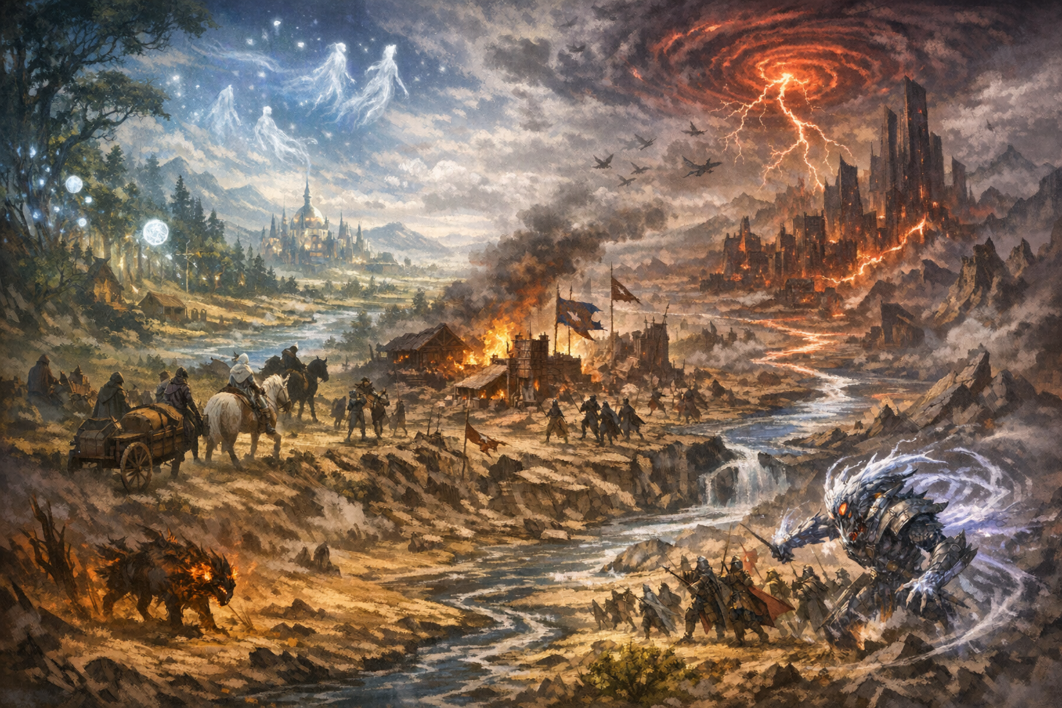 The environment, strained by the broken leygrid, grew increasingly volatile. Seasons drifted unpredictably. Pockets of wild arcana coalesced in forests and deserts, creating regions where beasts transformed or where fragments of wandering souls drifted through the air like silent rain. Storms rose from clear skies. Rivers changed course overnight. Travellers reported the appearance of beings whose forms corresponded to no natural law. Many such anomalies became warzones in their own right, as Vyrnos and Lycéya each sought to control or contain them.